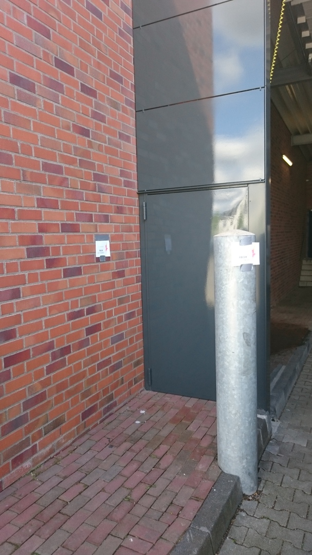 Glaselemente und feuerhemmende Tür hatten einen alten Farbton blau mit Hinterglasbeschichtung ( Farbe von hinten aufgetragen ). Neugestaltung in normaler Beschichtung frontseitg, da Glaselemente nicht mehr ausgebaut werden konnten.